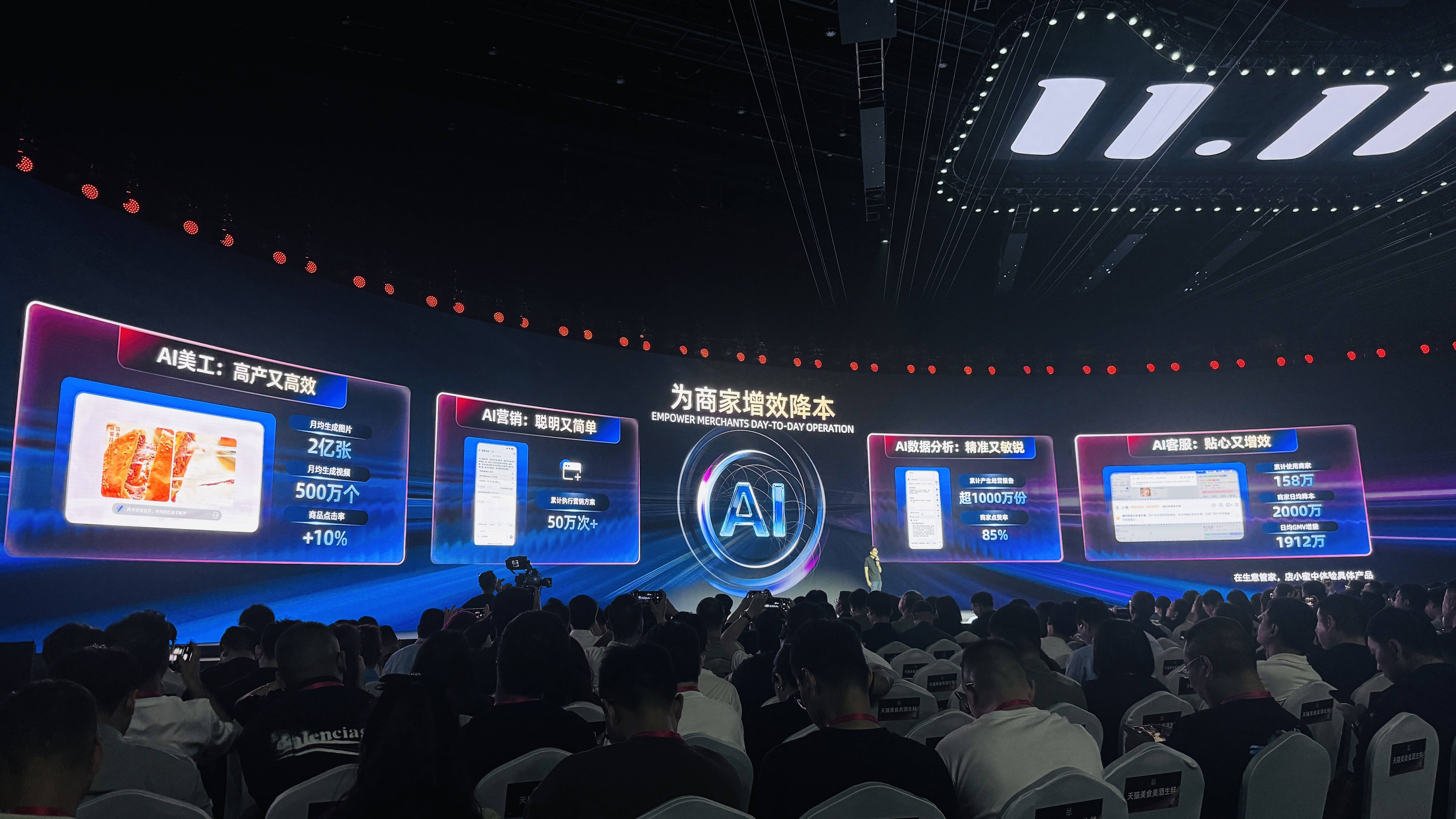 一组最新数据显示:AI美工每个月能生成2亿张图片,月均生成视频500万个,商品点击量提升10%;AI营销累计执行营销方案超50万次;AI数据分析累计产生超1000万份报告,商家点赞率达85%;AI客服累计使用商家达158万,商家日均降本2000万,日均GMV增量达1912万。