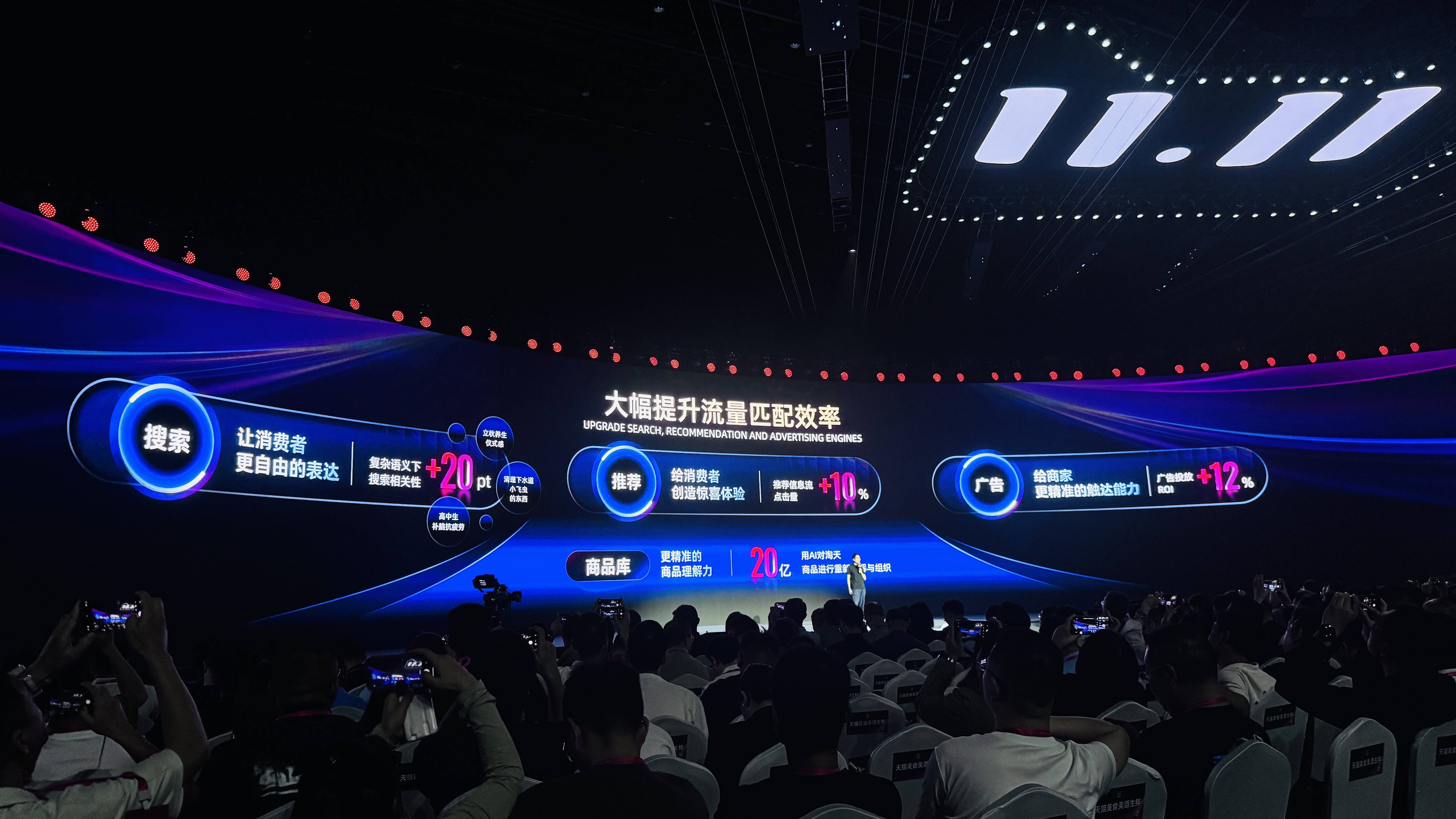 AI搜索让用户更自由地表达,复杂语义下搜索相关性提高20%,这是一个惊人的量级提升;AI推荐给消费者带来更惊喜体验,推荐信息流点击量提高了10%;AI广告则给商家更精准的触达能力,广告投放ROI提高超12%;AI商品库提供更精准的商品理解力,超20亿商品链接借助AI进行了重新理解和组织。